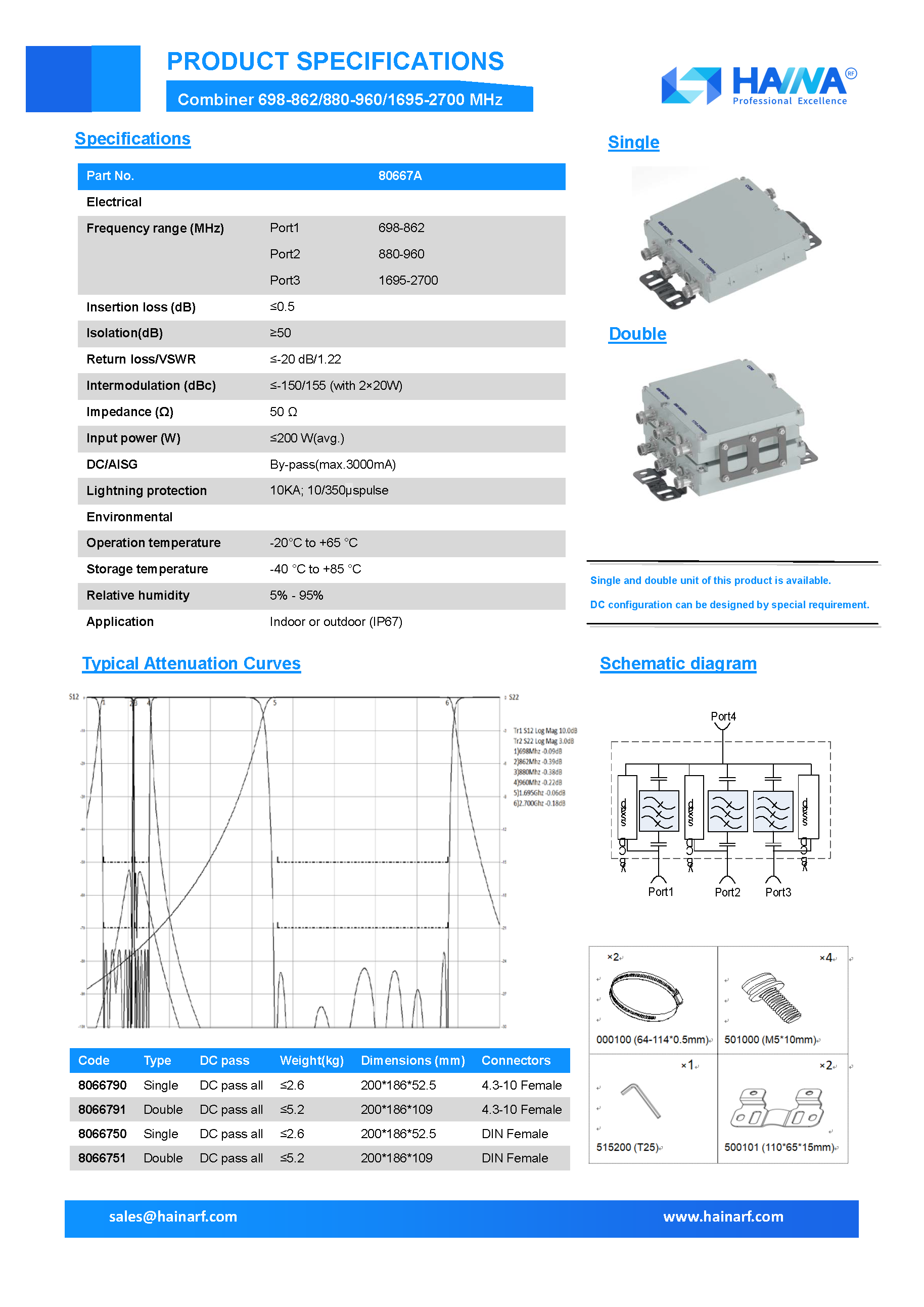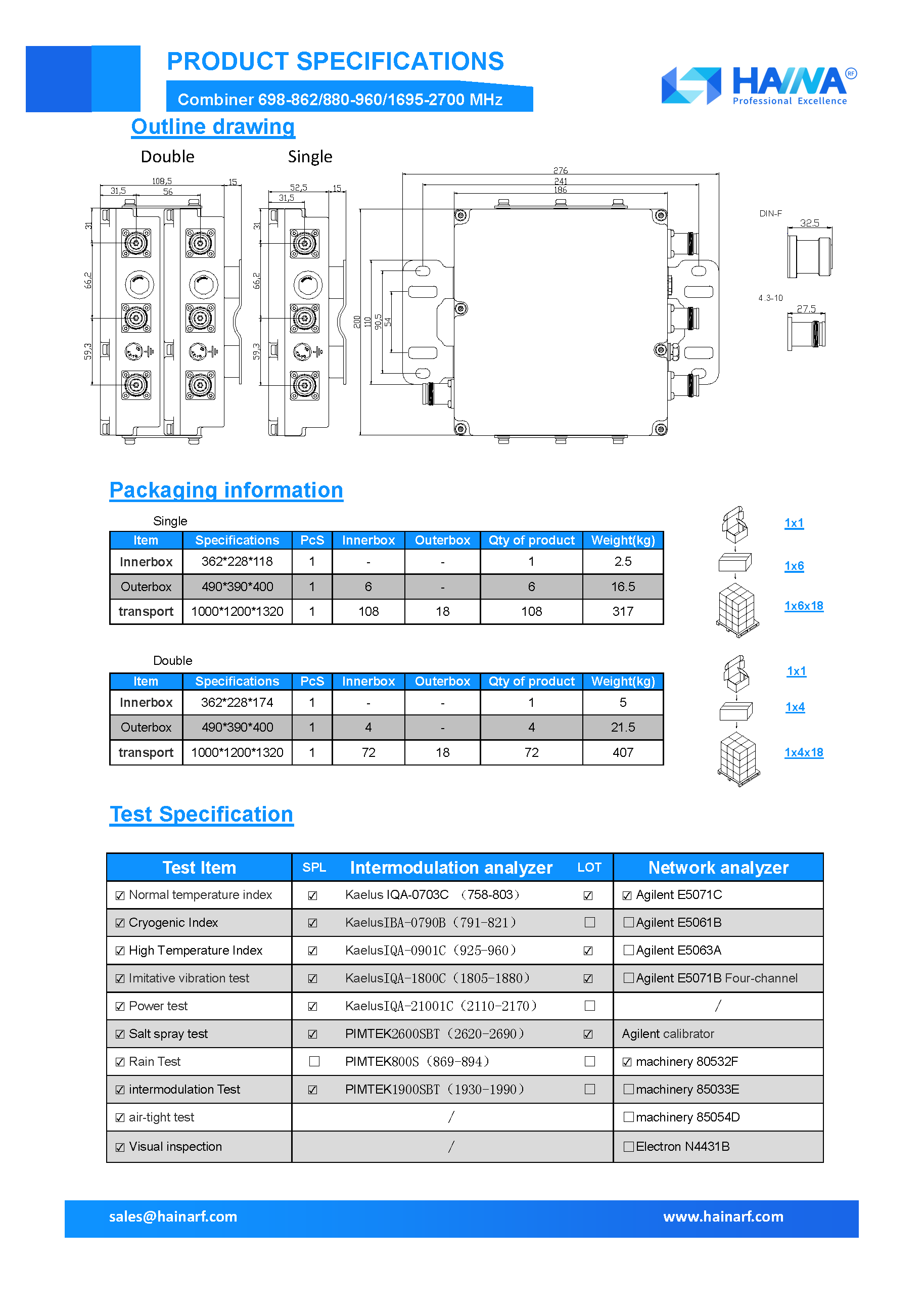 | Frequency range (MHz) | Port1:698-862 Port2 :880-960 Port3 :1695-2700 |