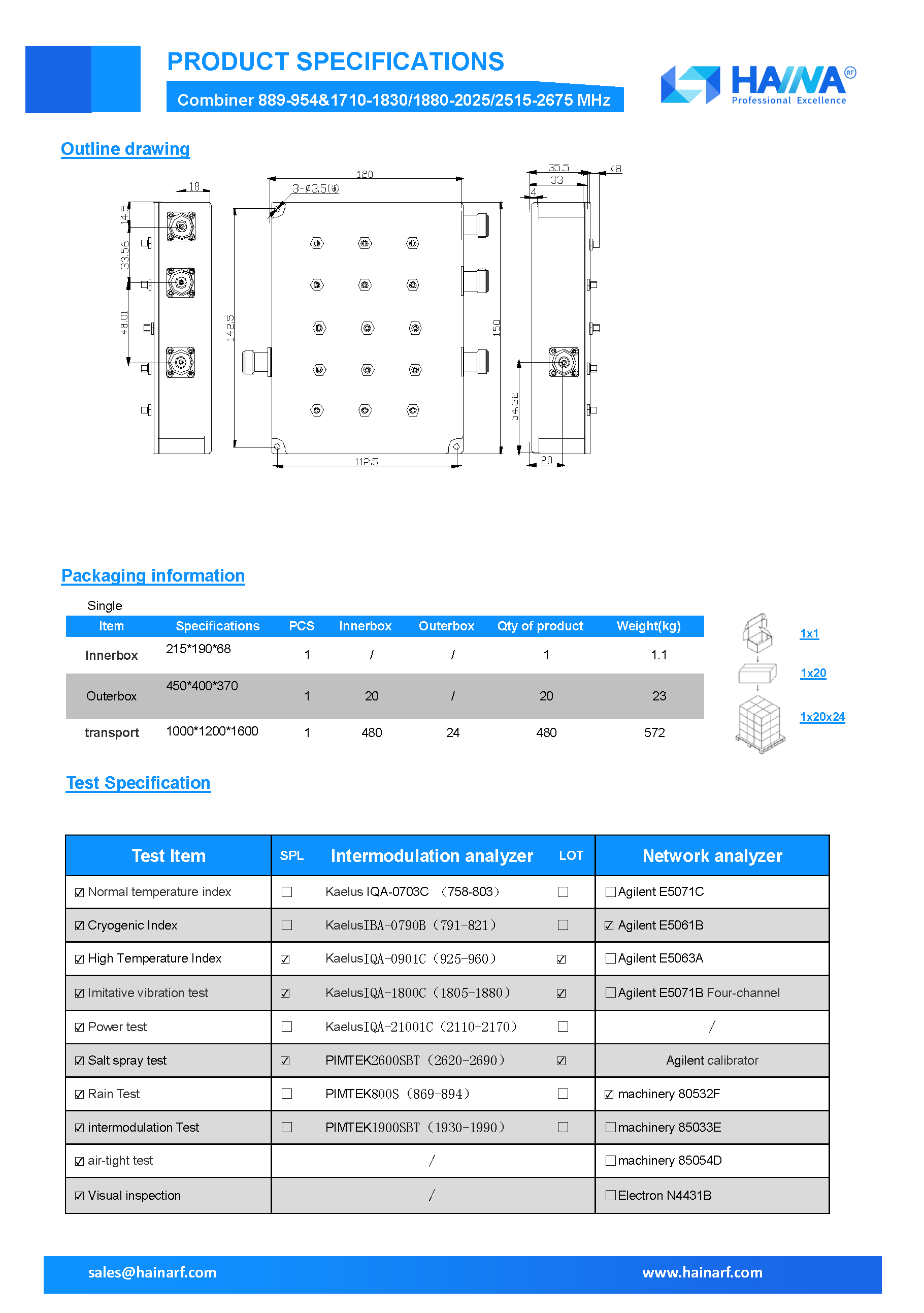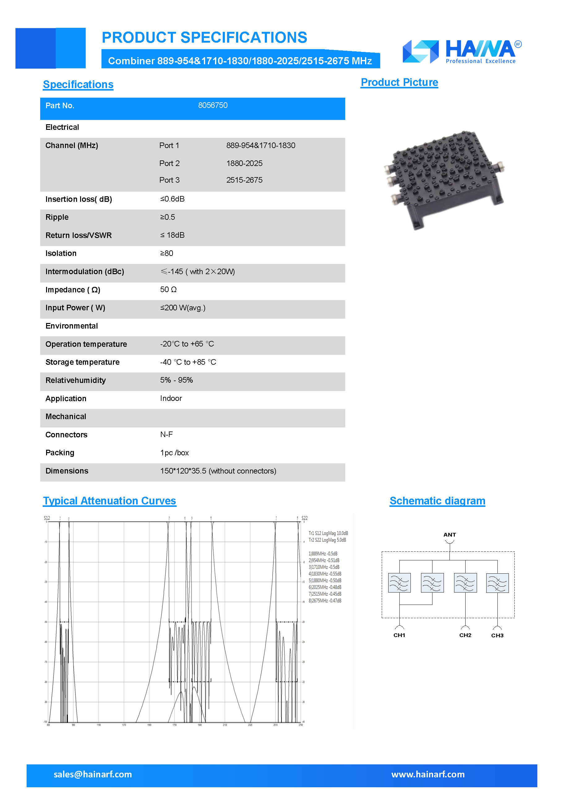 | Frequency range (MHz) | Port 1 :889-954&1710-1830 Port 2 :1880-2025 Port 3 :2515-2675 |