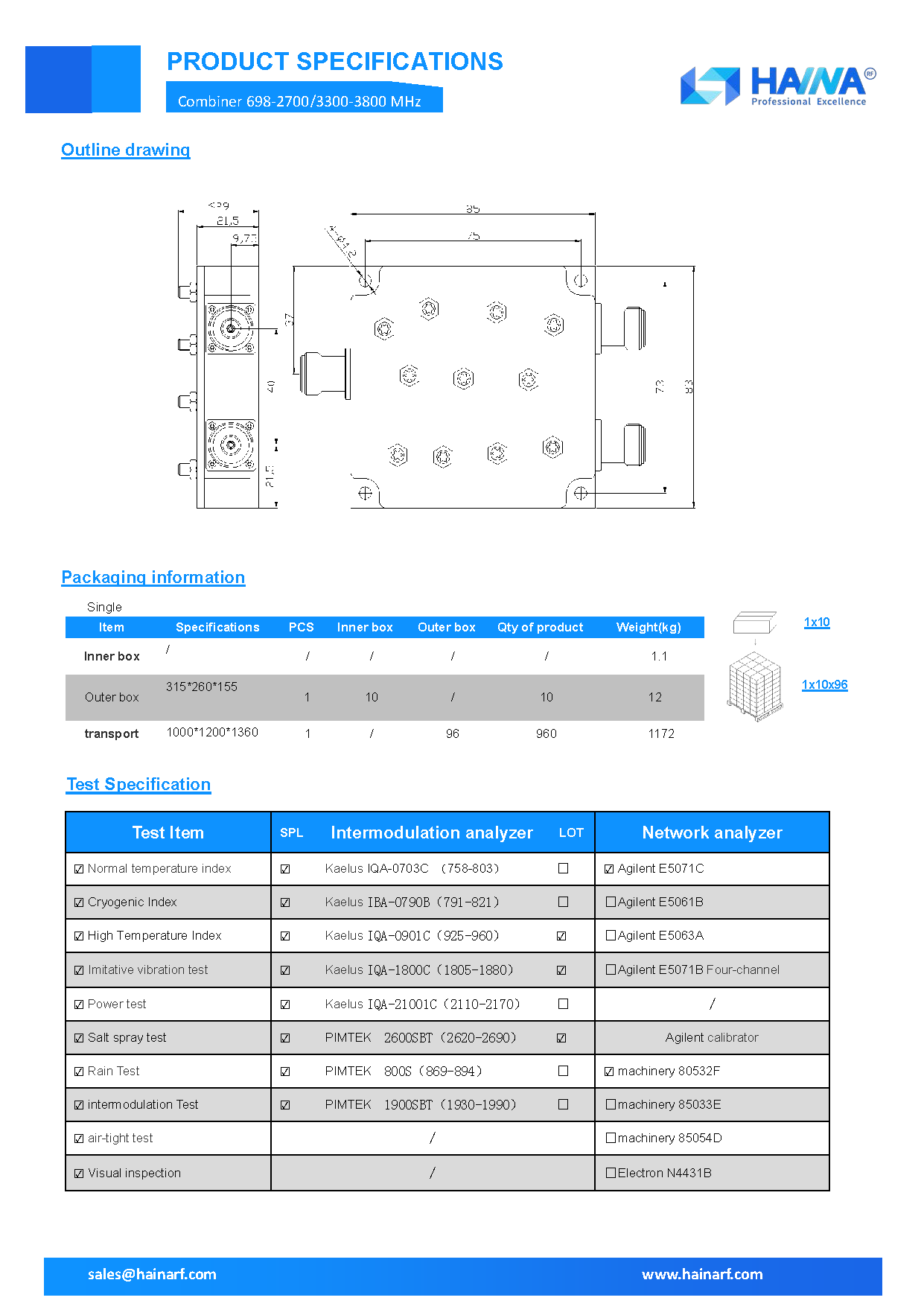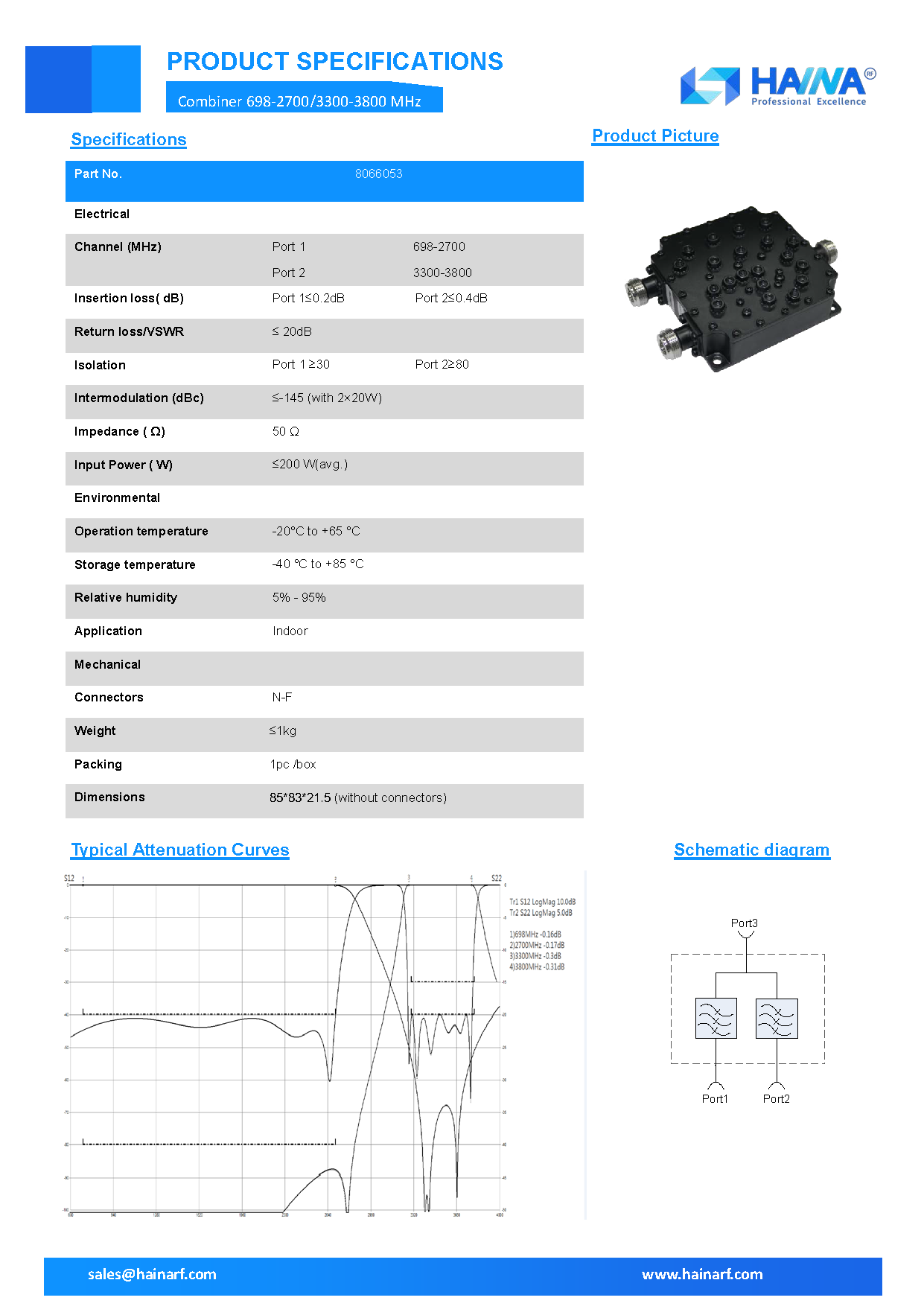 | Frequency range (MHz) | Port 1 :698-2700 Port 2: 3300-3800 |