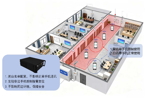 4、系统根据设置的黑白名单,对违规手机的通讯实施干扰、屏蔽,